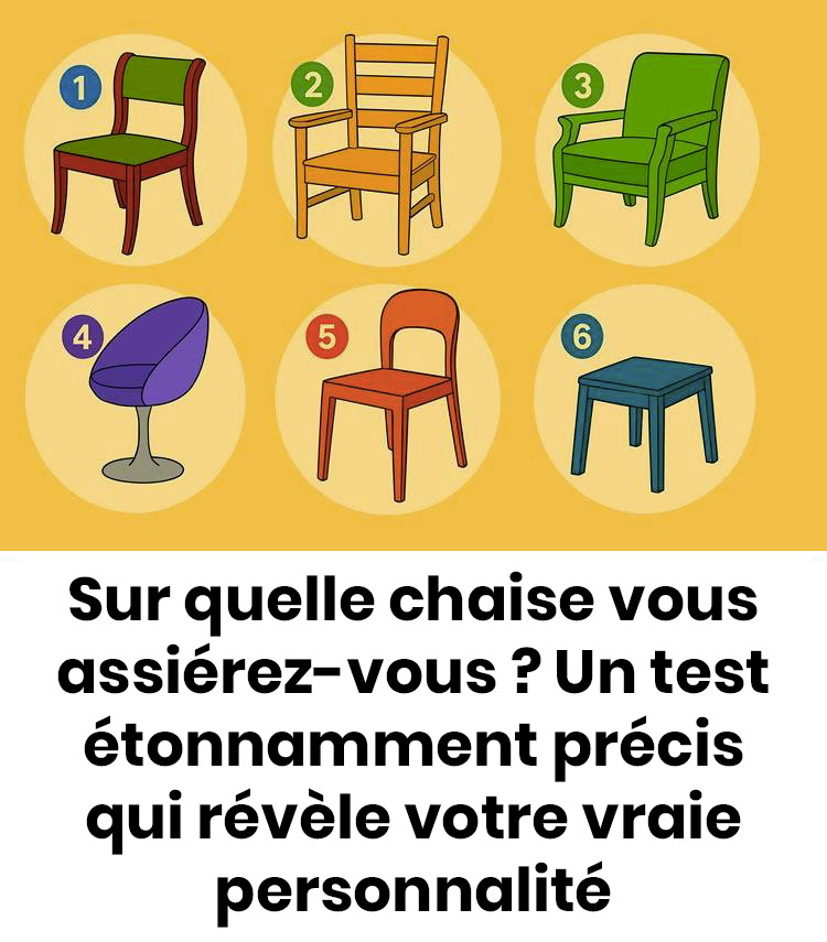 Enfin, si la sixième chaise vous a semblé la plus accueillante, vous incarnez la sérénité et l’équilibre, cherchant avant tout la simplicité. Pas besoin de grands frissons pour être heureuse : un quotidien structuré, des relations sincères et des projets concrets vous suffisent. Vous inspirez confiance, savez être discrète et faites preuve d’une loyauté sans faille. Une perle rare pour ceux qui ont la chance de vous connaître.